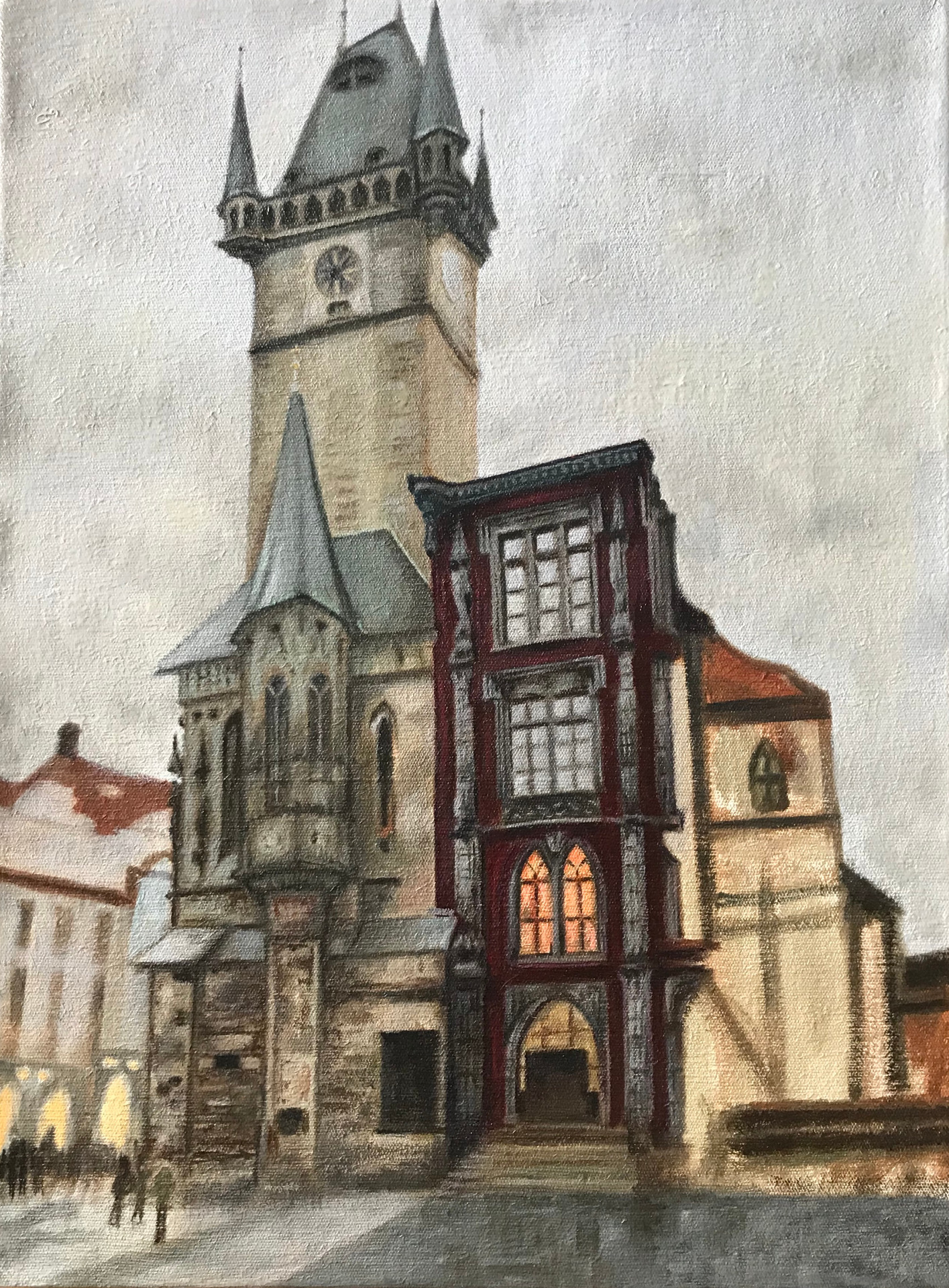 The famous Prague Orloj towers above the Old City Square, and I took some photos of it while walking with Max one day. The architectural paintings I had done up to that point were improving, but still not right. The compositions were boring and whatever had drawn me to the images in the first place was missing. So whenever someone was trying to tell me something important, I wasn't really listening because my head was solving the problem of how to paint buildings. One day I was trying to arrange canvases so nobody would notice how many unfinished ones were just lying around and I picked up this blank one, looked up the clock tower photo, reminded myself of what I wanted, and got to work.