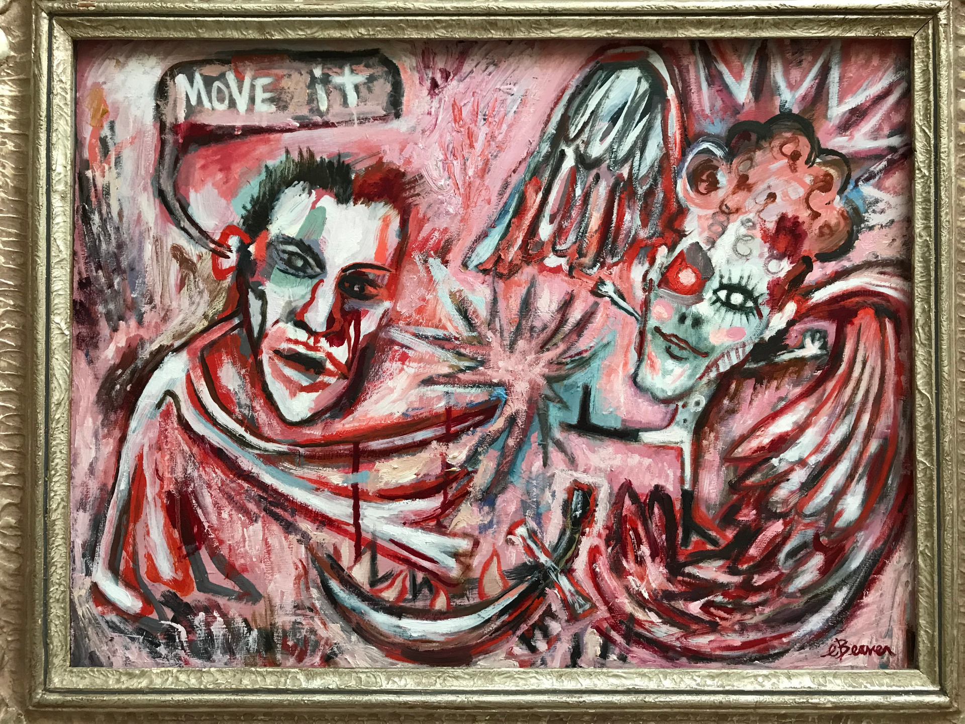What's it about? With this kind of painting I prefer to let the viewer's brain make up their own story. I like to think that a good painting can be "read" again and again and can take on different meanings for an individual over time. But there are a few visual clues as to what I was thinking when I drew the comic, and if pressed I could talk for a long, long (yawn!) time about extra layers of suggestive imagery I put into the painting. For me, it's just really fun to hang a big, bright pink thing on the wall.